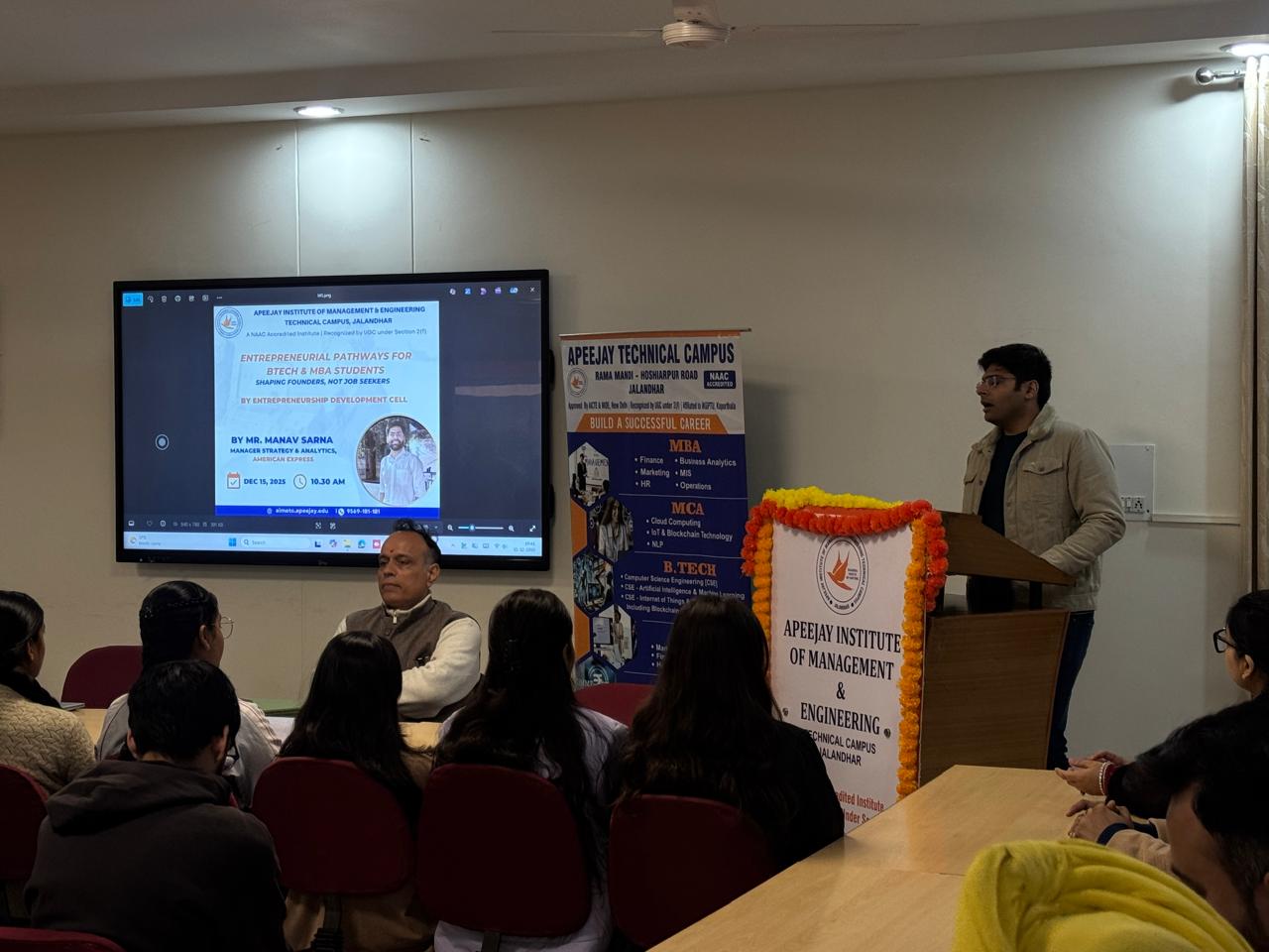 एपेजे इंस्टीट्यूट ऑफ मैनेजमेंट एंड इंजीनियरिंग टेक्निकल कैंपस के Entrepreneurship Development Cell (EDC) द्वारा छात्रों के लिए एक ज्ञानवर्धक guest lecture का सफल आयोजन किया गया। इस सत्र में अमेरिकन एक्सप्रेस के प्रोजेक्ट मैनेजर श्री मानव सरना ने मुख्य वक्ता के रूप में अपनी उपस्थिति दर्ज कराई।