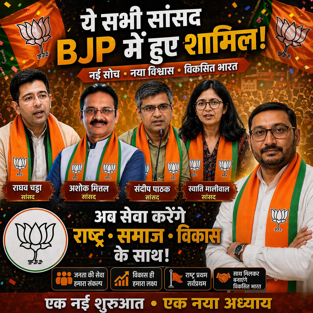आम आदमी पार्टी की सबसे बड़ी फूड सामने आई पंजाब और दिल्ली के सात राज्यसभा सांसद ने पार्टी छोड़ी और बीजेपी में शामिल होने का ऐलान किया । इन राज्य सभा सांसदों में संदीप पाठक, राघव चड्ढा, अशोक मित्तल, स्वाति मालीवाल, विजेंद्र गुप्ता, हरभजन सिंह आदि शामिल हैं। इन सभी सांसदों ने मिलकर आम आदमी पार्टी को एक बड़ा झटका दिया है । भारतीय जनता पार्टी पंजाब के वरिष्ठ नेता रजनीश सहगल ने यह जानकारी देते हुए बताया कि आम आदमी पार्टी के नेता व संयोजक अरविंद केजरीवाल की कार्य नीति से यह सभी सांसद बहुत दुखी थे क्योंकि आम आदमी पार्टी में केजरीवाल हिटलर राज चला रहे थे और अपने आप को सर्वोपरि बता रहे थे जिसका एक उदाहरण दिल्ली में अरविंद केजरीवाल के द्वारा बनाया गया शीश महल शामिल है । रजनीश सहगल ने बताया कि इस बड़ी फूट से पंजाब में आम आदमी का पार्टी का भविष्य लगभग समाप्त हो गया है। जैसा दिल्ली की जनता ने केजरीवाल व उसकी पार्टी को दिल्ली से बाहर का रास्ता दिखाया उसी तरह से आने वाले समय में पंजाब की राजनीति में भी आम आदमी पार्टी का सुफड़ा साफ नजर आता है क्योंकि पंजाब में भगवंत मन की सरकार से यहां की जनता पहले से ही दुखी है भगवंत मान व पंजाब सरकार की जो भी योजनाएं पंजाब में चल रही हैं आधी से ज्यादा योजनाएं तो यहां लागू ही नहीं हो पाई हैं । जिसका मुख्य उदाहरण स्वास्थ्य बीमा योजना या महिलाएं को 1500-1000 रुपए प्रति महीना देना शामिल हैं। पंजाब की जनता को भी लगता है कि भगवंत मान अरविंद केजरीवाल की कठपुतली की तरह काम कर रहे हैं । रजनीश सहगल ने बताया कि पंजाब में आने वाले समय में भारतीय जनता पार्टी की सरकार बनना तय है और भारतीय जनता पार्टी अकेले ही पंजाब में अपनी सरकार बनाएगी । क्योंकि पंजाब की जनता बीजेपी को राज्य में लाना चाहती है और पंजाब की जनता को भी मालूम है कि भारतीय जनता पार्टी ही पंजाब में अमन शांति, नशे से छुटकारा, धर्म परिवर्तन जैसे मुद्दों पर काम कर सकती है । आम आदमी पार्टी से अलग हुए सात सांसदों में ज्यादातर सांसद पंजाब से ही राज्यसभा गए हुए हैं और पंजाबियों की भावनाओं को समझते हैं जैसे की देशभर से कांग्रेस का सफाया होता जा रहा है वैसे ही दिल्ली, पंजाब और अन्य राज्यों से आम आदमी पार्टी का भी सुपड़ा साफ होना लगभग तय है।