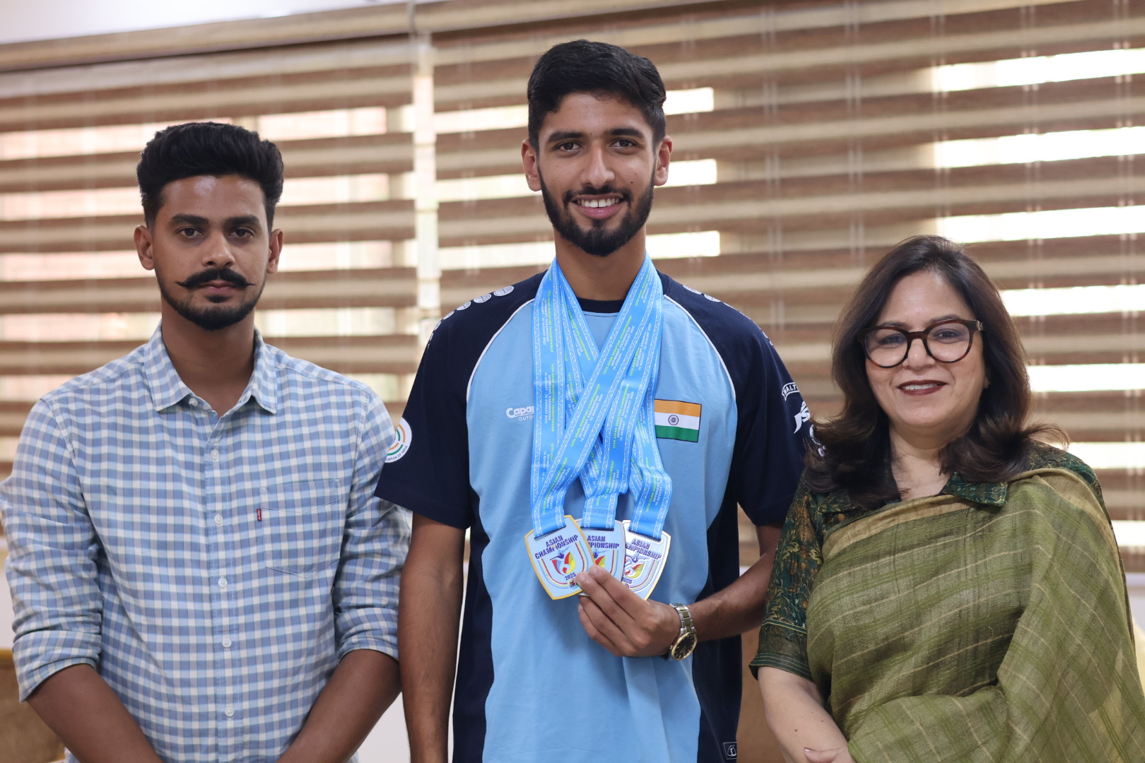 एपीजे कॉलेज ऑफ फाइन आर्ट्स जालंधर के विद्यार्थी प्रत्येक क्षेत्र में बुलंदियों को चूमने का हौसला रखते हुए कॉलेज को गौरवान्वित करते ही रहते हैं। इसी श्रृंखला में कॉलेज के बैचलर ऑफ डिजाइन पांचवें सेमेस्टर के विद्यार्थी हरमेहर सिंह लाली ने कजाकिस्तान में आयोजित एशियन शूटिंग चैंपियनशिप में स्कीट शूटिंग जूनियर टीम मैन में स्वर्ण पदक,स्कीट शूंटिंग जूनियर मिक्स टीम में स्वर्ण पदक एवं स्कीट शूटिंग जूनियर मैन इंडिविजुअल में रजत पदक प्राप्त करके न केवल कॉलेज का नाम रोशन किया बल्कि अपने अभिभावकों को भी गौरवान्वित किया। हरमेहर सिंह लाली ने नई दिल्ली में आयोजित इंटरनेशनल स्पोर्ट्स शूंटिंग फेडरेशन में अपनी टीम के साथ खेलते हुए जूनियर वर्ल्ड कप में चतुर्थ स्थान हासिल किया। डॉ नीरजा ढींगरा ने हरमेहर सिंह की शानदार उपलब्धियों पर बधाई देते हुए कहा कि हमें हमेशा से ही हरमेहर सिंह लाली पर गर्व रहा है और हम यही शुभकामना करते हैं कि वह भविष्य में भी वह स्कीट शूटिंग में अपनी प्रतिभा का शानदार प्रदर्शन करते हुए श्रेष्ठ स्थान को प्राप्त करता हुआ अपने देश का नाम विश्व स्तर पर रोशन करें। हरमेहर सिंह लाली को मार्गदर्शन देने के लिए उन्होंने फिजिकल एजुकेशन विभाग के प्राध्यापक श्री साहिल महे के प्रयासों की भी सराहना की।