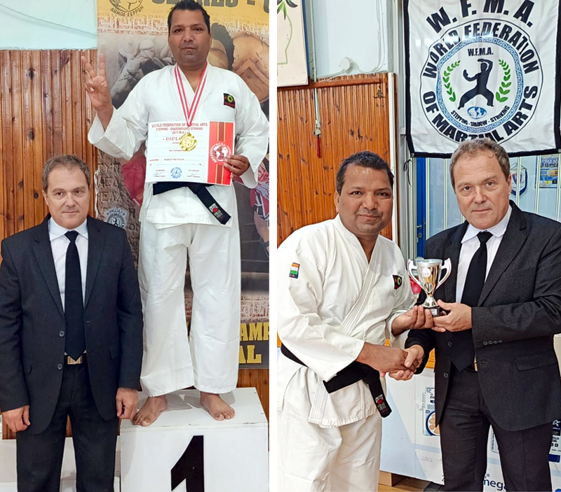 फगवाड़ा 30 मई (शिव कौड़ा) सैनी इंडियन स्कूल आफ सैल्फ डिफेंस क्लब के चीफ कराटे कोच नरेश कुमार (थर्ड डिग्री ब्लैक बेल्ट, यू.के.) ग्रीस में आयोजित अन्तर्राष्ट्रीय कराटे चैंपियनशिप में भाग लेकर लौट आये हैं। उन्होंने उक्त प्रतियोगिता में न केवल स्वर्ण पदक हासिल किया बल्कि वल्र्ड फैडरेशन आफ मार्शल आर्ट्स द्वारा गोजू रियू कर्राटे स्टाईल का आफिशियल मैंबर सर्टीफिकेट भी लेकर लौटे हैं। इसके अलावा चैंपियनशिप के आयोजक और हैलेनिक फैडरेशन आफ मार्शल आटर््स ग्रीस के प्रधान समायरिस थोमस प्रधान एवं महासचिव सिक्रिकोनिस लोनिन ने उन्हें तीसरी डिग्री ब्लैक बैल्ट का सर्टीफिकेट प्रदान किया है। जिसे पाकर वे बेहद खुशी अनुभव कर रहे हैं। उनकी इस उपलब्धि से मार्शल आर्ट्स प्रेमियों में भी खुशी की लहर है और उन्हें शुभकामनाएं देने वालों का तांता लगा हुआ है। सैनी इंडियन स्कूल आफ सैल्फ डिफेंस क्लब में मार्शल आर्ट्स का प्रशिक्षण ले रहे युवाओं ने उन्हें खास तौर पर अपनी शुभकामनाएं दी हैं।