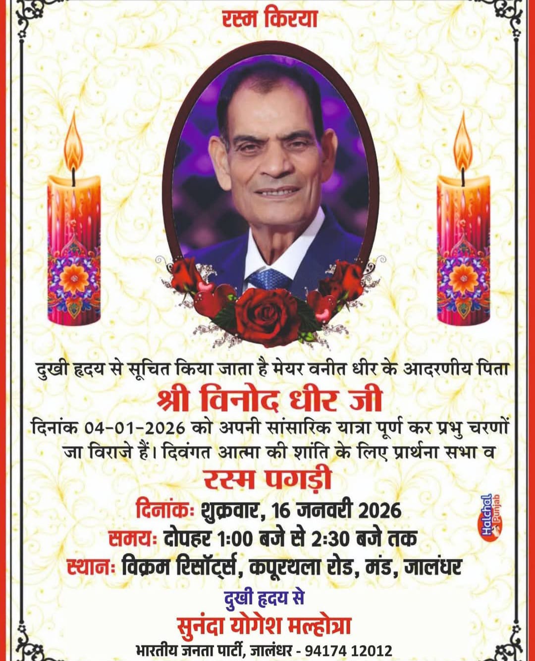 जालंधर: जालंधर के मेयर विनीत धीर के पिता स्वर्गीय विनोद धीर की रस्म क्रिया कल यानी शुक्रवार को 16 तारीख को विक्रम रिजॉर्ट दोपहर 1:00 बजे से लेकर 2:00 बजे तक होगी आपको बता दें मेयर विनीत धीर के स्वर्गीय पिता विनोद धीर एक उच्च श्रेणी के शिक्षा शास्त्री भी रह चुके हैं उन्होंने अपना लंबा समय लुधियाना के आर्य कॉलेज में राजनीति शास्त्र के प्रोफेसर के साथ-साथ वाइस प्रिंसिपल भी रह चुके हैं उन्होंने लुधियाना में ना केवल शिक्षा के क्षेत्र में अपनी पहचान बनाई है साथ में सामाजिक और धार्मिक कार्यों में भी अपनी लुधियाना और जालंधर में हर वक्त क्याओ में जुटे रहे। जहां पर वह सामाजिक तौर पर लोगों के साथ रहे परिवार की तरफ से अगर देखा जाए उनका बेटा जालंधर के मेयर है वही उनके दामाद राहों (नवांशहर)
