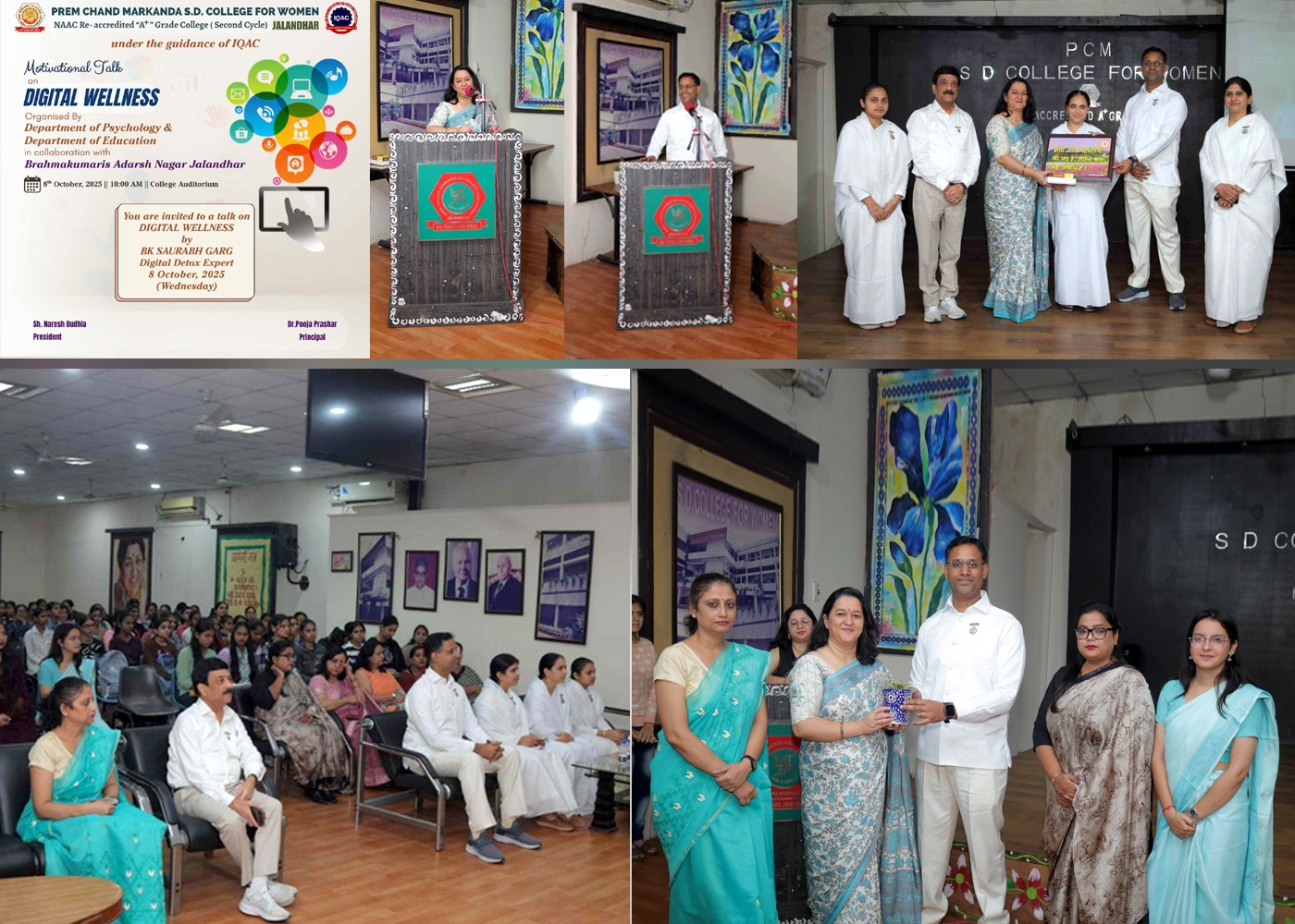 पीसीएम एस.डी. महिला महाविद्यालय, जालंधर के शिक्षा एवं मनोविज्ञान विभाग ने आंतरिक गुणवत्ता आश्वासन प्रकोष्ठ (आईक्यूएसी) के तत्वावधान में ब्रह्माकुमार, प्रसिद्ध डिजिटल डिटॉक्स विशेषज्ञ और सॉफ्टवेयर डेवलपर सौरभ गर्ग द्वारा “डिजिटल वेलनेस” पर एक प्रेरक व्याख्यान का आयोजन किया। प्राचार्य डॉ. पूजा पराशर ने अतिथियों का हार्दिक स्वागत किया। उनका व्याख्यान डिजिटल माइंडफुलनेस और सचेतन जीवन के क्षेत्र पर केंद्रित था। उन्होंने कहा कि प्रौद्योगिकी की गति के साथ तालमेल बिठाने के लिए, प्रौद्योगिकी के साथ एक संतुलित संबंध बनाने की तत्काल आवश्यकता है – ऐसा संबंध जो भावनात्मक संतुलन, मानसिक स्पष्टता और समग्र कल्याण को बढ़ावा दे। अपने गहन विचार-विमर्श और परिवर्तनकारी विचारों के माध्यम से, उन्होंने आधुनिक दुनिया में सतत जीवन, सचेतन जुड़ाव और प्रौद्योगिकी के उद्देश्यपूर्ण उपयोग पर आधारित जीवन का समर्थन किया। उन्होंने श्रोताओं को न्यूरोप्लास्टिसिटी और स्मृति समेकन जैसी नवीन अवधारणाओं से परिचित कराया, और मस्तिष्क की सीखने और अनुभव के माध्यम से स्वयं को पुनः संयोजित करने की क्षमता का संकेत दिया।