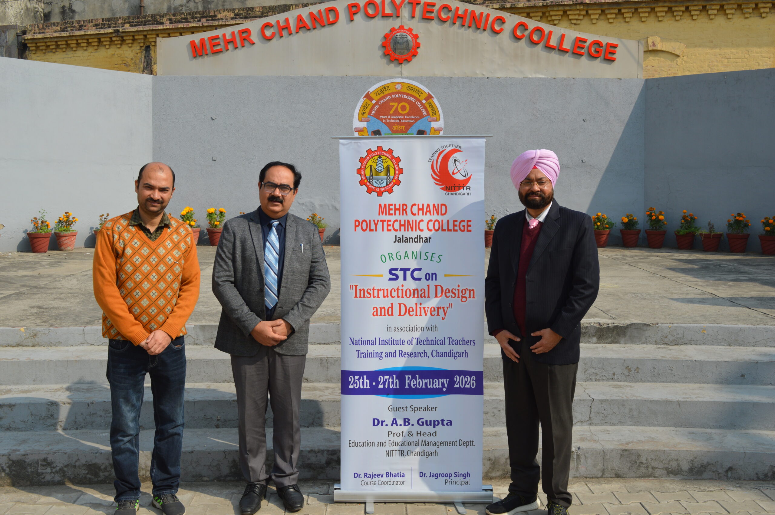 मेहर चंद पॉलिटेक्निक कॉलेज, जालंधर में निट्टर चंडीगढ़ द्वारा 25 फरवरी से 27 फरवरी 2026 तक तीन दिवसीय शॉर्ट टर्म कोर्स आयोजित किया जा रहा है। इस कोर्स का विषय “इंस्ट्रक्शनल डिजाइन एंड डिलीवरी” होगा। प्राचार्य डॉ. जगरूप सिंह ने बताया कि प्रो. ए.बी. गुप्ता, अध्यक्ष, एजुकेशनल विभाग, निट्टर, इस कोर्स के मुख्य संसाधन व्यक्ति (रिसोर्स पर्सन) होंगे। इस कार्यक्रम में विभिन्न संस्थानों के 35-40 शिक्षक भाग लेंगे, जिनमें प्रमुख रूप से मेहर चंद पॉलिटेक्निक कॉलेज, डीएवीआईईटी जालंधर, गुरु नानक देव पॉलिटेक्निक लुधियाना तथा रामगढ़िया पॉलिटेक्निक फगवाड़ा आदि शामिल हैं।