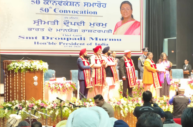 अमृतसर: दिल्ली भारत की राष्ट्रपति द्रौपदी मुर्मू आज गुरु नानक देव यूनिवर्सिटी के 50वें कान्वोकेशन समारोह में चीफ गेस्ट के तौर पर शामिल हुई इस दौरान वाइस चांसलर प्रो. करमजीत सिंह ने फूलों का गुलदस्ता देकर राष्ट्रपति का स्वागत किया।इस बीच, पंजाब के गवर्नर गुलाब चंद कटारिया भी राष्ट्रपति के साथ कान्वोकेशन समारोह हॉल पहुंचे, जहां राष्ट्रगान के साथ समारोह शुरू हुआ। इस मौके पर पंजाब के शिक्षा मंत्री हरजोत सिंह बैंस, MP विक्रमजीत सिंह साहनी और वाइस चांसलर प्रो. करमजीत सिंह भी राष्ट्रपति के साथ स्टेज पर मौजूद थे।राष्ट्रपति ने पहले हॉल के अंदर सिंडिकेट और फिर सीनेट मेंबर्स से मुलाकात की। VC प्रो. डॉ. करमजीत सिंह ने गुरु नानक देव यूनिवर्सिटी की एकेडमिक, स्पोर्ट्स और सह-पाठयक्रम क्षेत्र में उपलब्धियों पर रोशनी डाली और चीफ गेस्ट समेत सभी का स्वागत और धन्यवाद किया