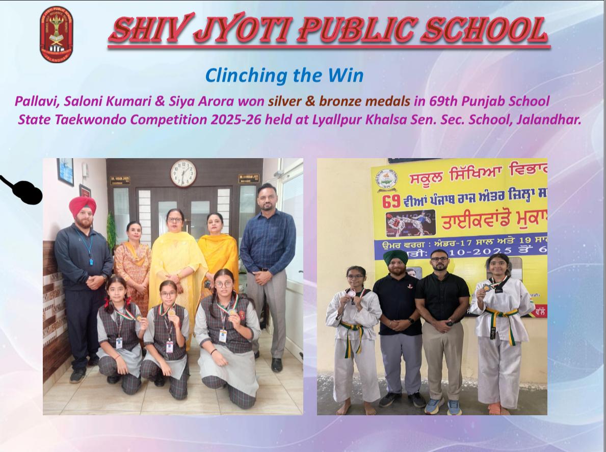 ● विद्यालय प्रबंधन और प्रधानाचार्या श्रीमती प्रवीण सैली के कुशल मार्गदर्शन में में गत दिनों ‘लायलपुर खालसा सी. सै. स्कूल, जालंधर में 69वीं पंजाब स्कूल स्टेट गेम्स ‘ताइक्वांडो प्रतियोगिता’ 25-26’ का आयोजन किया गया, जिसमें दसवीं कक्षा की प्रतिभाशली छात्राओं- पल्लवी, सलोनी कुमारी, सिया अरोड़ा ने U-17 आयु वर्ग में अठतीस से अठसठ किलोग्राम से अधिक भार वर्ग के अंतर्गत भाग लिया। पल्लवी ने ताइक्वांडो के दावपेंच खेलते हुए अपने उत्कृष्ट प्रदर्शन के आधार पर रजत पदक हासिल किया। सलोनी कुमारी और सिया अरोड़ा ने भी शानदार प्रदर्शन करते हुए कांस्य पदक प्राप्त किए।