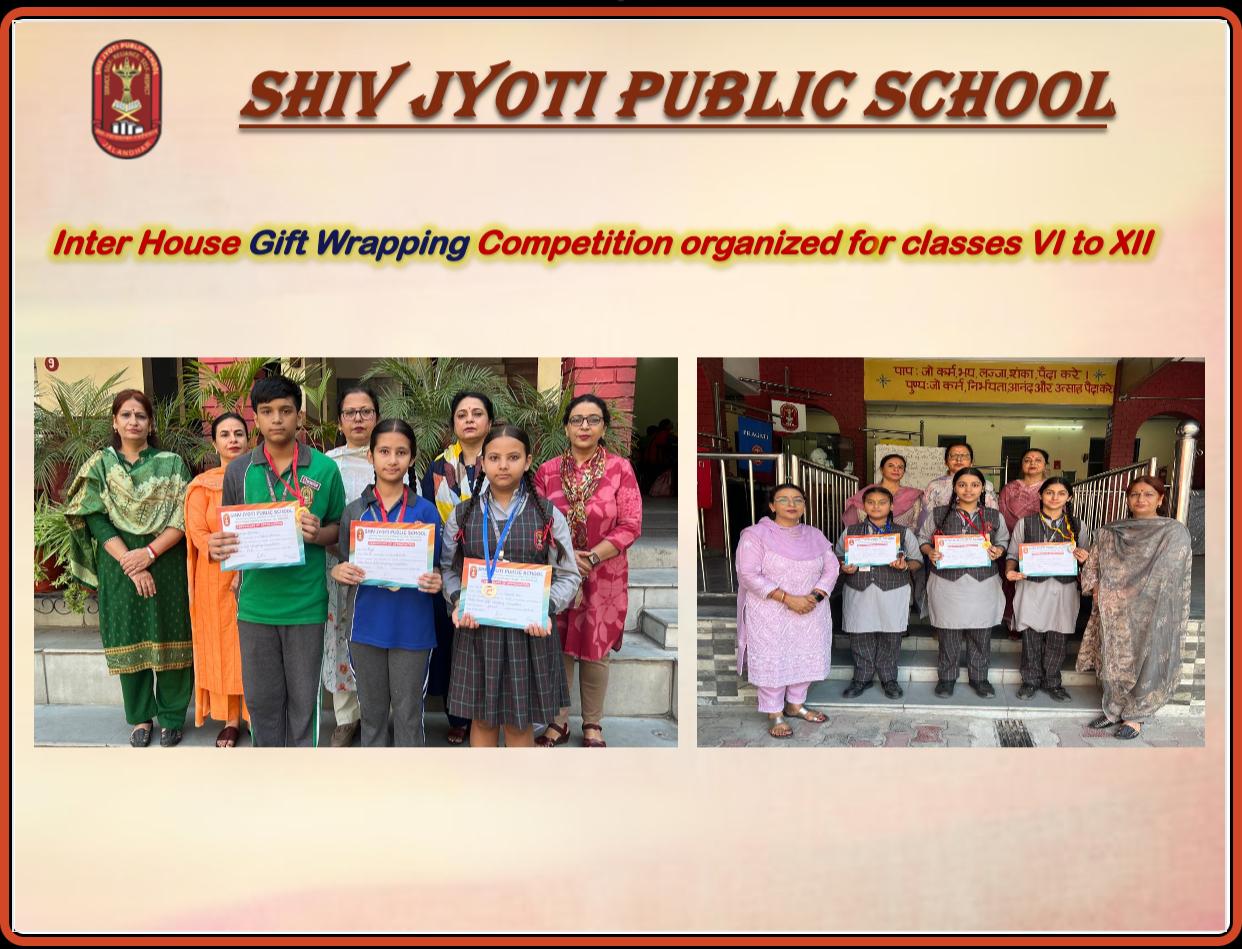 ● विद्यालय प्रबंधन एवं प्रधानाचार्या श्रीमती प्रवीण सैली के नेतृत्त्व में विद्यार्थियों के रचनात्मक कौशल को निखारने हेतु विभिन्न प्रतियोगितओं का आयोजन किया जा रहा है। गतिविधि प्रभारी श्रीमती रंजू शर्मा द्वारा छठी से बारहवीं कक्षा के विद्यार्थियों के लिए ‘अंतर्सदनीय गिफ़्ट रैपिंग प्रतियोगिता’ आयोजित करवाई गई, जिसमें विद्यार्थियों ने उत्साहपूर्वक भाग लेते हुए अपने कलात्मक कौशल का प्रदर्शन किया। श्रीमती रंजू शर्मा और श्रीमती सुमन खन्ना के निर्णयानुसार सर्वश्रेष्ठ प्रदर्शन करते हुए प्रगति, धैर्य शर्मा और वाणी सोनी ने अपने-अपने कक्षा वर्ग में पहला स्थान प्राप्त किया। प्रधानाचार्या श्रीमती प्रवीण सैली ने उपप्रधानाचार्या श्रीमती रमनदीप तथा सहायक उपप्रधानाचार्या श्रीमती ममता अरोड़ा के साथ विजेताओं को पदक तथा प्रशस्तिपत्र देकर उनका मनोबल बढ़ाया।