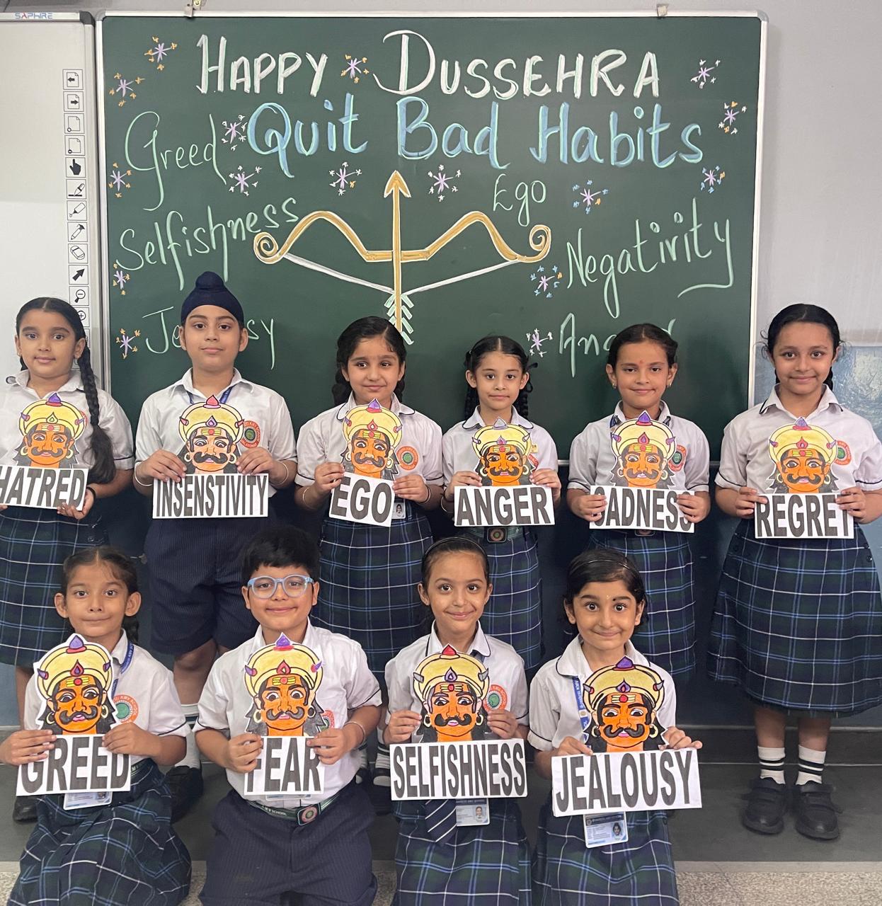 दशहरा उत्सव के अंतर्गत प्री प्राइमरी विंग के नन्हें – मुन्ने बच्चों के द्वारा सीता हरण की झाँकी प्रस्तुत की । कक्षा पहली एवं दूसरी के छात्रों को बुराई पर अच्छाई की विजय के प्रतीक रूप में एनिमेटेड फिल्म दिखाई गई। कुछ छात्रों ने रावण के दस सिरों का प्रतीकात्मक प्रदर्शन कर नकारात्मक भावनाओं जैसे क्रोध, लोभ, अहंकार का दमन करने की सीख दी । स्कूल प्रधानाचार्या श्रीमती रचना मोंगा जी ने अपने प्रेरणादायक संबोधन में बच्चों को महात्मा गांधी और लाल बहादुर शास्त्री जी की शिक्षाओं को आत्मसात करने और उन्हें जीवन में अपनाने का संदेश दिया । उन्होंने छात्रों, उनके अभिभावकों को बुराई पर अच्छाई की जीत का पर्व विजयादशमी की शुभकामनाएँ देते हुए अंतर्मन में छिपे रावण रूपी अहंकार का अंत कर सत्यता के मार्ग पर चलने के लिए प्रेरित किया ।