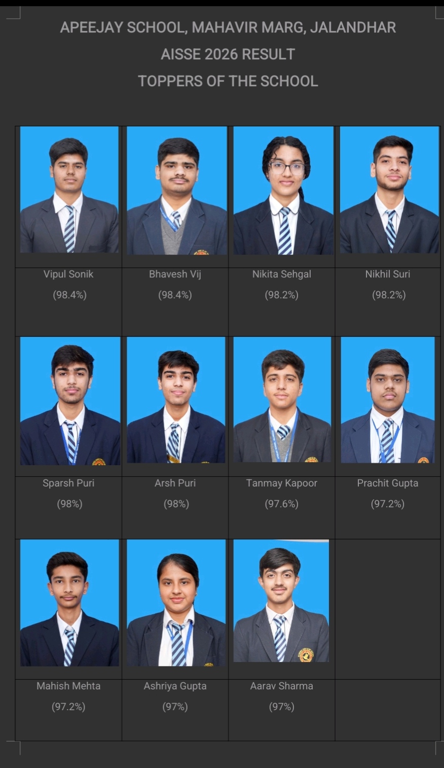 एपीजे स्कूल महावीर मार्ग जालंधर ने सी.बी.एस.ई द्वारा घोषित 10वीं की परीक्षा में अपनी कर्मनिष्ठ, प्रतिभावान सुश्री सुषमा पॉल बर्लिया जी (चेयरपर्सन, एपीजे एजुकेशन, को फाउंडर एंड चांसलर, एपीजे सत्य यूनिवर्सिटी, चेयरपर्सन एंड प्रेसिडेंट, एपीजे सत्य और स्वर्ण ग्रुप, चेयरपर्सन-एपीजे सत्य एजुकेशन रिसर्च फाऊंडेशन) के सकारात्मक और कुशल नेतृत्व और आशीर्वाद से एक बार फिर से सफलता का परचम लहराया।