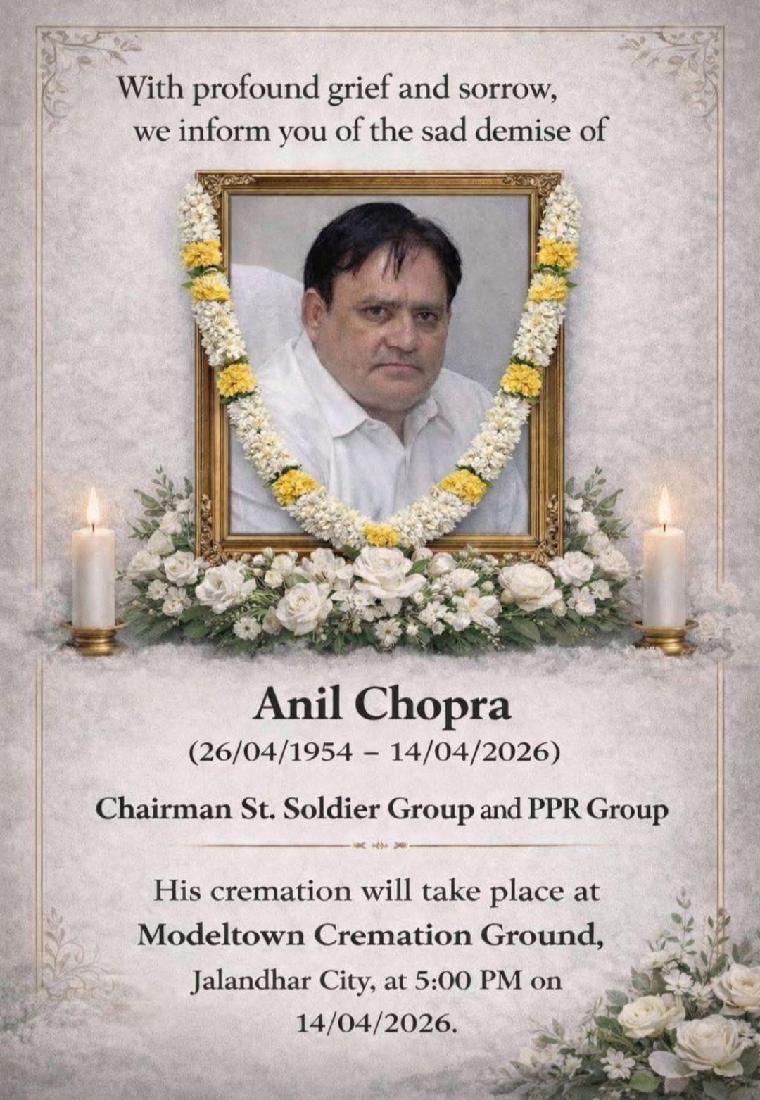 जालंधर: बहुत भारी मन से, मैं श्री अनिल चोपड़ा के निधन की खबर शेयर करता हूँ। वे एक अच्छे दिल वाले इंसान थे, जो मेरे लिए एक परिवार से कहीं ज़्यादा थे। वे मेरी प्रोफेशनल यात्रा में ताकत के पिलर और गाइड करने वाले थे। एक महान शिक्षाविद, कॉलोनाइज़र और होटलियर, और सम्मानित राजनीतिक व्यक्तित्व, समाज में उनका योगदान बहुत बड़ा और प्रेरणा देने वाला था। मेरे लिए वे हमेशा सपोर्ट, ज्ञान और हौसला बढ़ाने वाले थे। मुझ पर उनके विश्वास ने मेरा रास्ता बनाने में मदद की और मुश्किल समय में मुझे ताकत दी। उनके जाने से मेरी ज़िंदगी में एक ऐसा खालीपन आ गया है जिसे भरा नहीं जा सकता। मैं उनके मार्गदर्शन और आशीर्वाद के लिए हमेशा उनका आभारी रहूँगा। भगवान उनकी आत्मा को शांति दे। अनिल चोपड़ा जी का अंतिम संस्कार 5:00 बजे मॉडल टाउन शमशान भूमि में होगा उदय दर्पण परिवार चोपड़ा परिवार को हर तरह की संवेदना प्रकट करता है