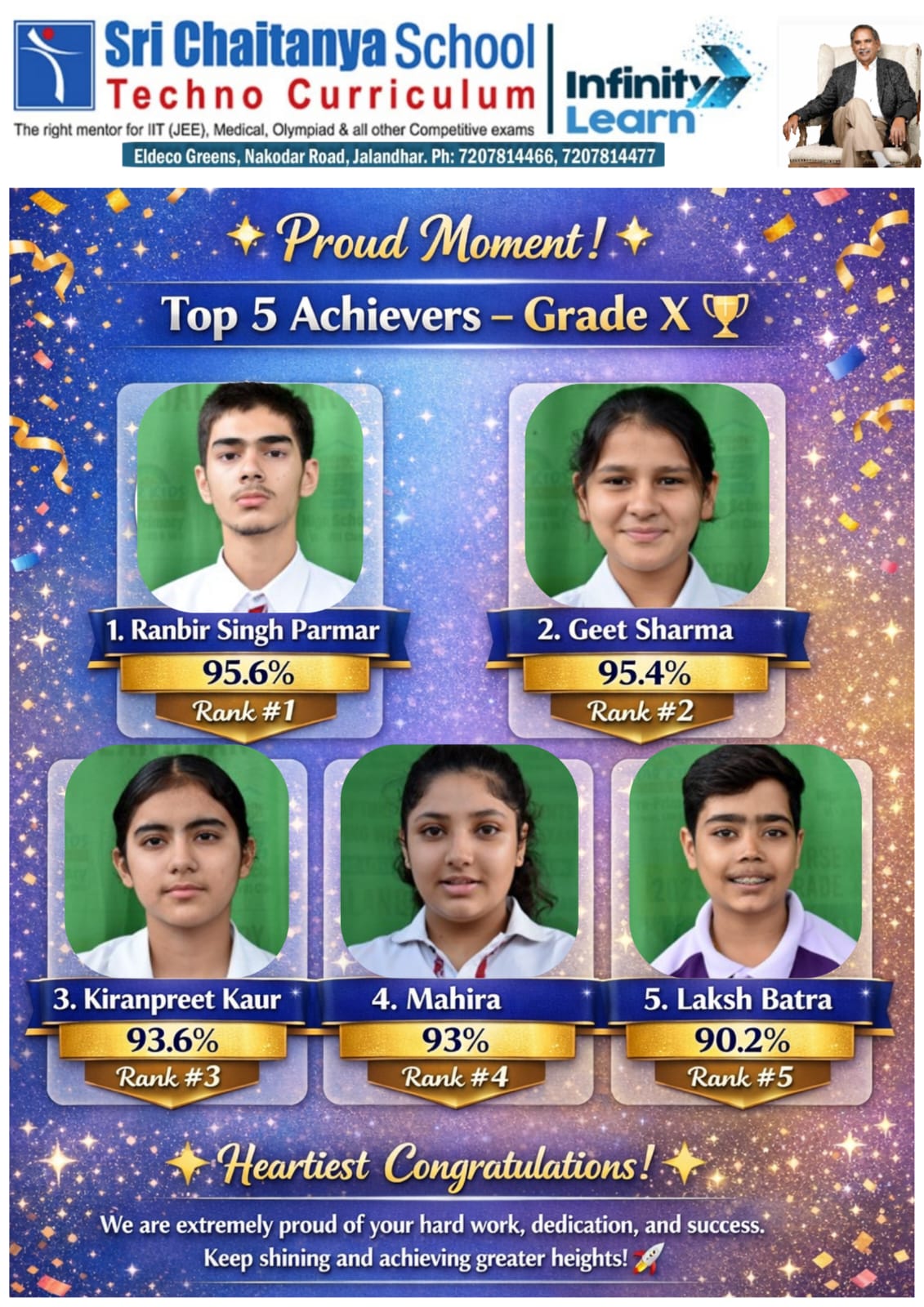 जालंधर: SCTS जालंधर के लिए गर्व का पल हमारे होनहार स्टूडेंट्स ने 2025–26 क्लास X बोर्ड एग्जाम में बहुत अच्छे रिजल्ट हासिल किए हैं। हमारे सभी अचीवर्स को उनकी कड़ी मेहनत, लगन और सफलता के लिए दिल से बधाई।